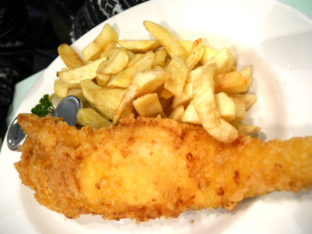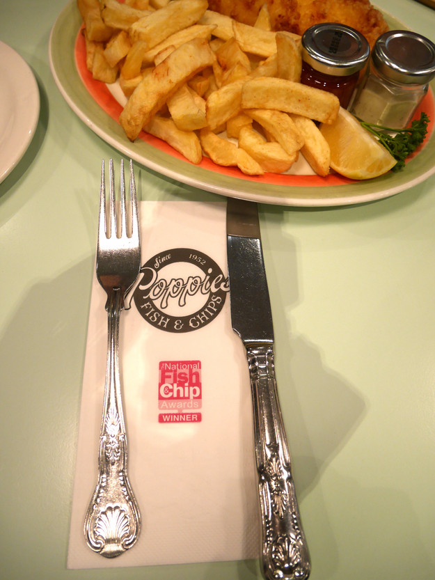 就是这家,Poppies Fish & Chips,店里室内美式复古风格的设计很有feel。话说这是我来英国目前吃最贵的一餐,平时都超级省,很时常自己煮,这次就犒赏自己吧!本身对西餐没什么见解,所以也没有觉得超级特别好吃,哈哈,不错啦(YY别打我)
